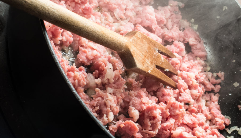 - フライパンでひき肉を炒め、色が変わったら野菜を加えます。
